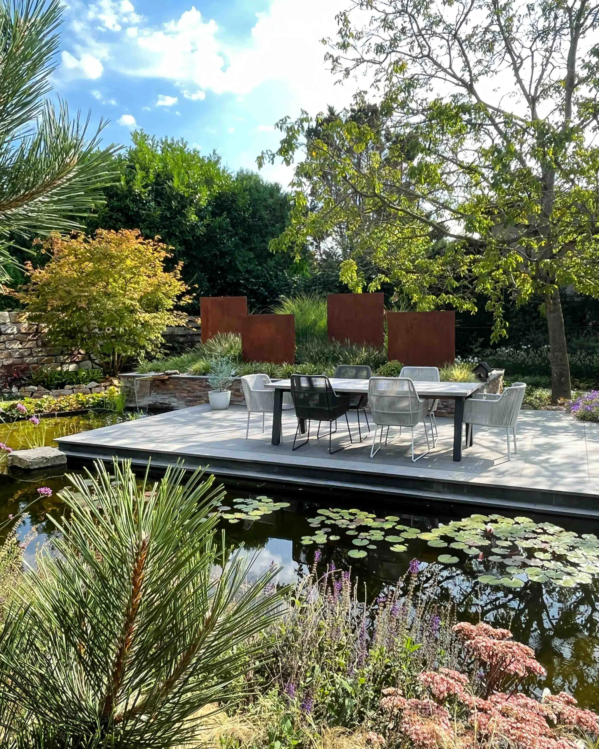 Deze tuin biedt een speelse en rustgevende sfeer door het gebruik van waterpartijen, zoals een vijver en waterval. Het geluid van stromend water zorgt voor ontspanning, terwijl het ontwerp een perfecte balans creëert tussen natuur en schoonheid.